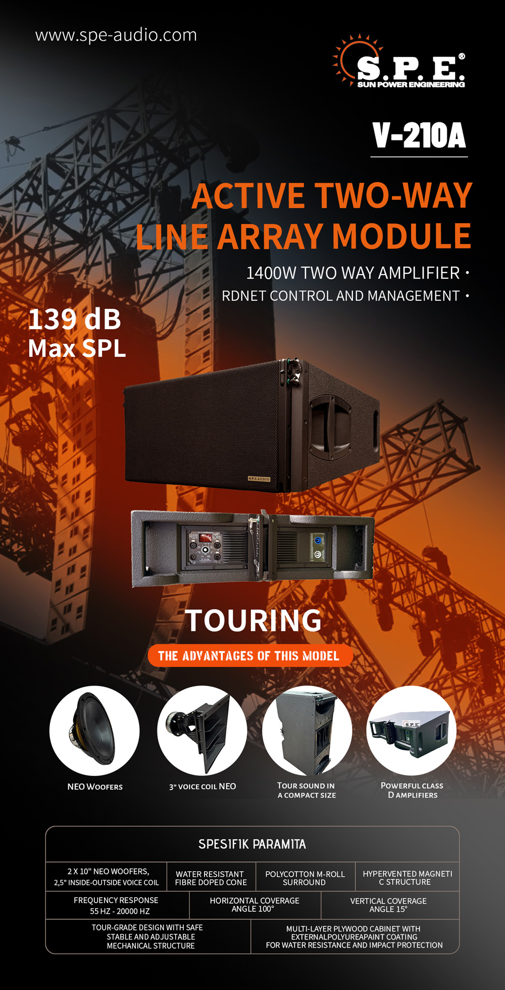 The V-210A is a truly active, high-power, plug-and-play touring sound system. It features a built-in efficient digital amplifier, intelligent DSP processing, FIR filters, and multi-channel tuning, enabling exceptional Sound Pressure Level (SPL) output while reducing power requirements.